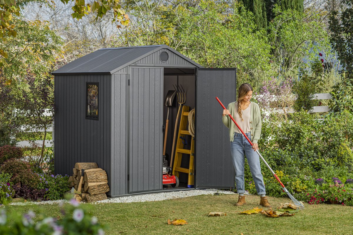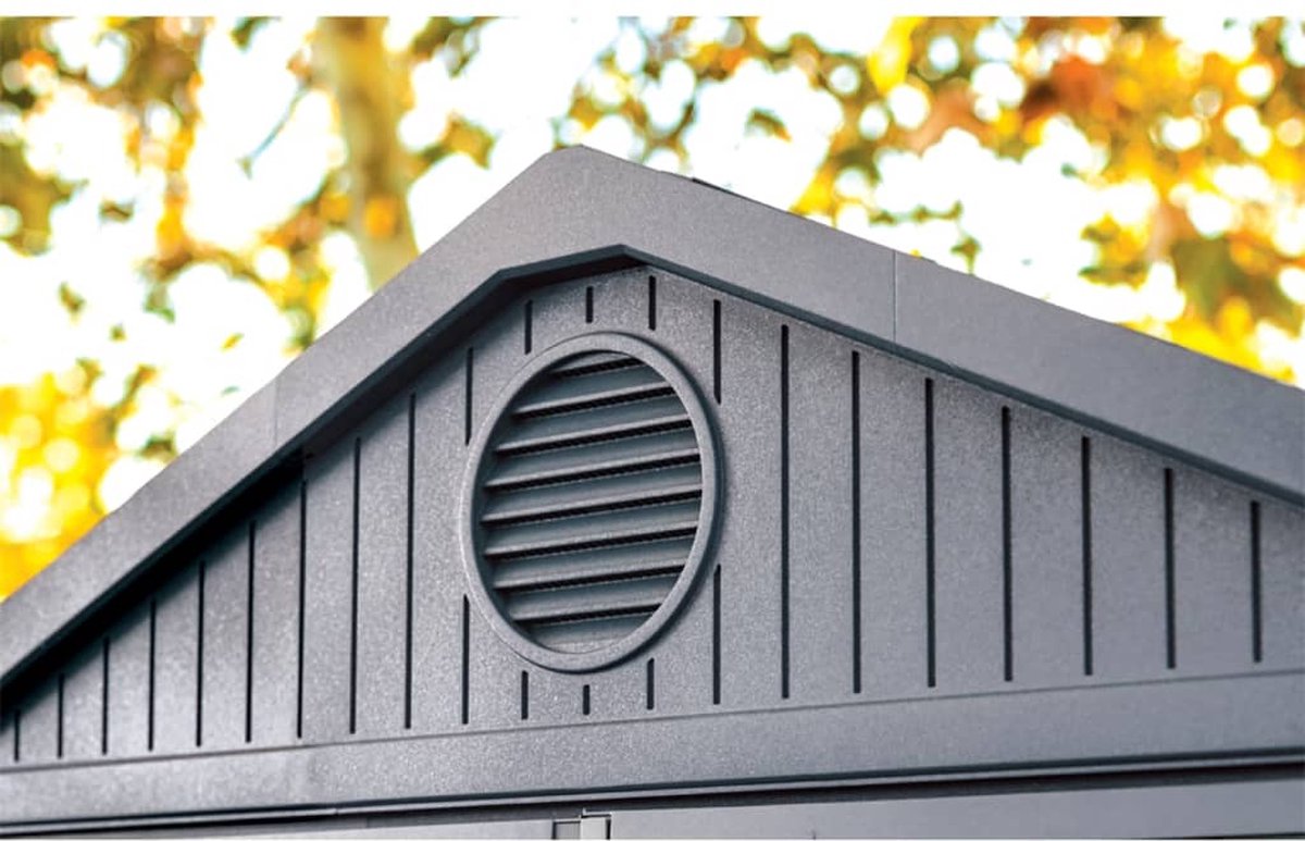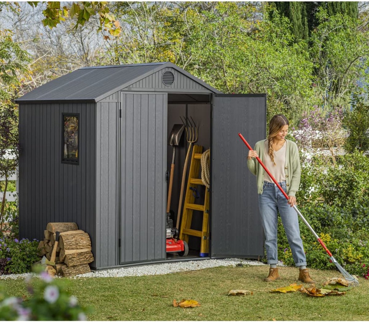 Het Keter Darwin 66 Tuinhuis is de ultieme tuinberging. Met dubbele deuren en een ongelooflijk ruim interieur, weet je dat het past. Berg tuingereedschap, tuinmeubilair en nog veel meer veilig op. De met metaal versterkte dubbelwandige tong-en-groef constructie van de Darwin 66 is ongelooflijk sterk en stijf, en het bevat hardware als je hem wilt vergrendelen. Praktische details zoals een ventilatieopening voor luchtcirculatie en een raam en dakraam voor een goed verlicht interieur zijn inbegrepen, en Evotech-wandpanelen geven het de schoonheid en het gevoel van hout zonder enig onderhoud.