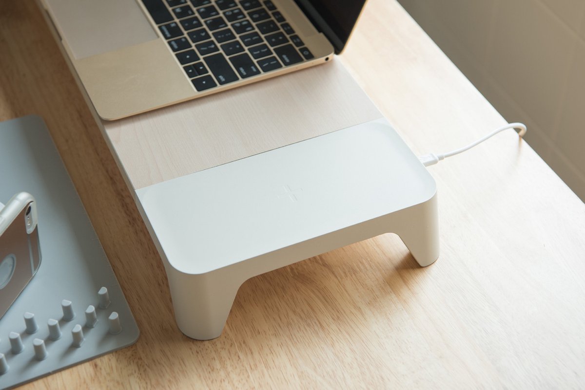 Laat uw Apple magic keyboard en de muis toe om eronder te schuiven, waardoor je rotzooi op je bureau vermijd als je het niet gebruikt. Sluit de standaard gewoon aan via een micro-USB-kabel naar je MacBook, iMac of andere monitor, en het wordt ook een draadloze oplaadplaat voor uw iPhone of elke andere telefoon die gebruik maakt van de draadloze oplaadtechnologie.